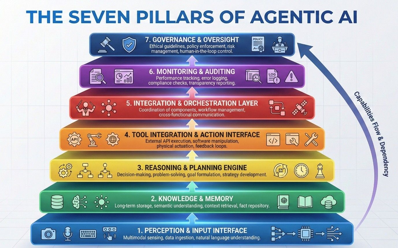 \ Under the hood, successful agentic AI systems tend to share a common architectural DNA. In my work, I often break this down into seven pillars: critical components that must work in harmony to move an AI agent from a nifty proof-of-concept to a reliable, production-grade solution. These pillars form a kind of layered stack of capabilities, from how an agent perceives input at the bottom up to how it is governed at the top. You can think of it as a vertical slice through an AI agent’s “brain and body.” If any layer is weak, the whole agent can stumble. Getting all seven in place is key to scaling an agent beyond toy problems. Let’s briefly explore each pillar and some design checkpoints and lessons learned for each.