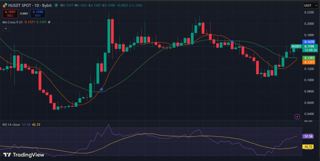 • The token is trading above its 9-day and 21-day moving averages, with RSI near 58.