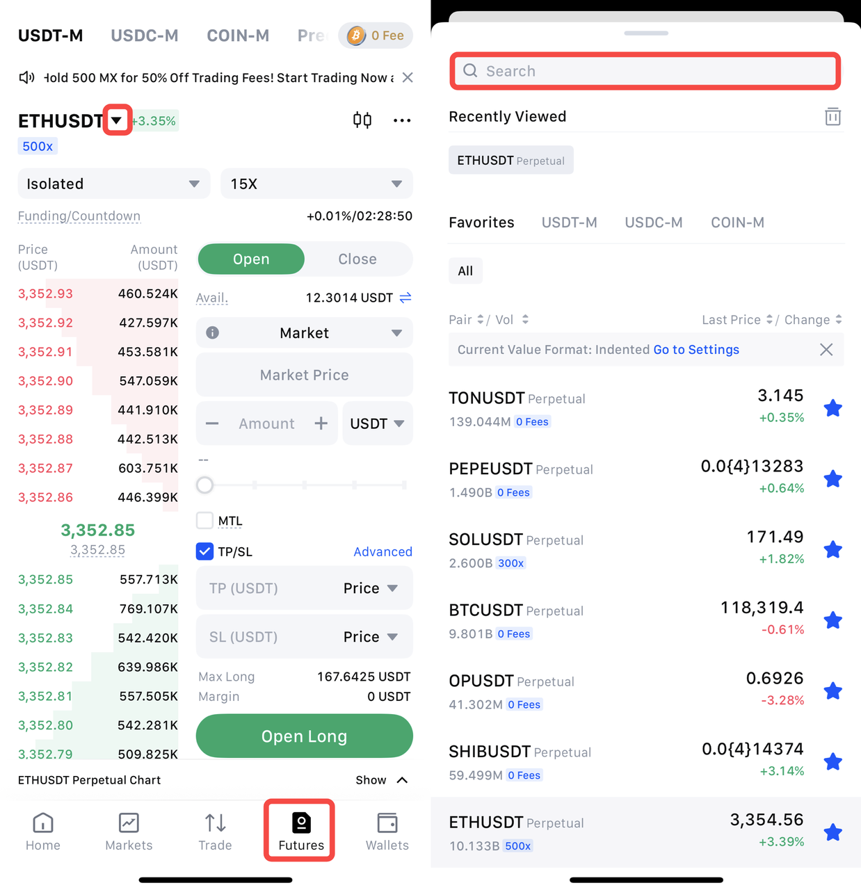 App 端: 建议将 MEXC App 升级至 6.17.0 或更高版本。进入合约交易页面后,可以在顶部的搜索框中直接输入想要交易的美股合约名称(如“AAPL”)。