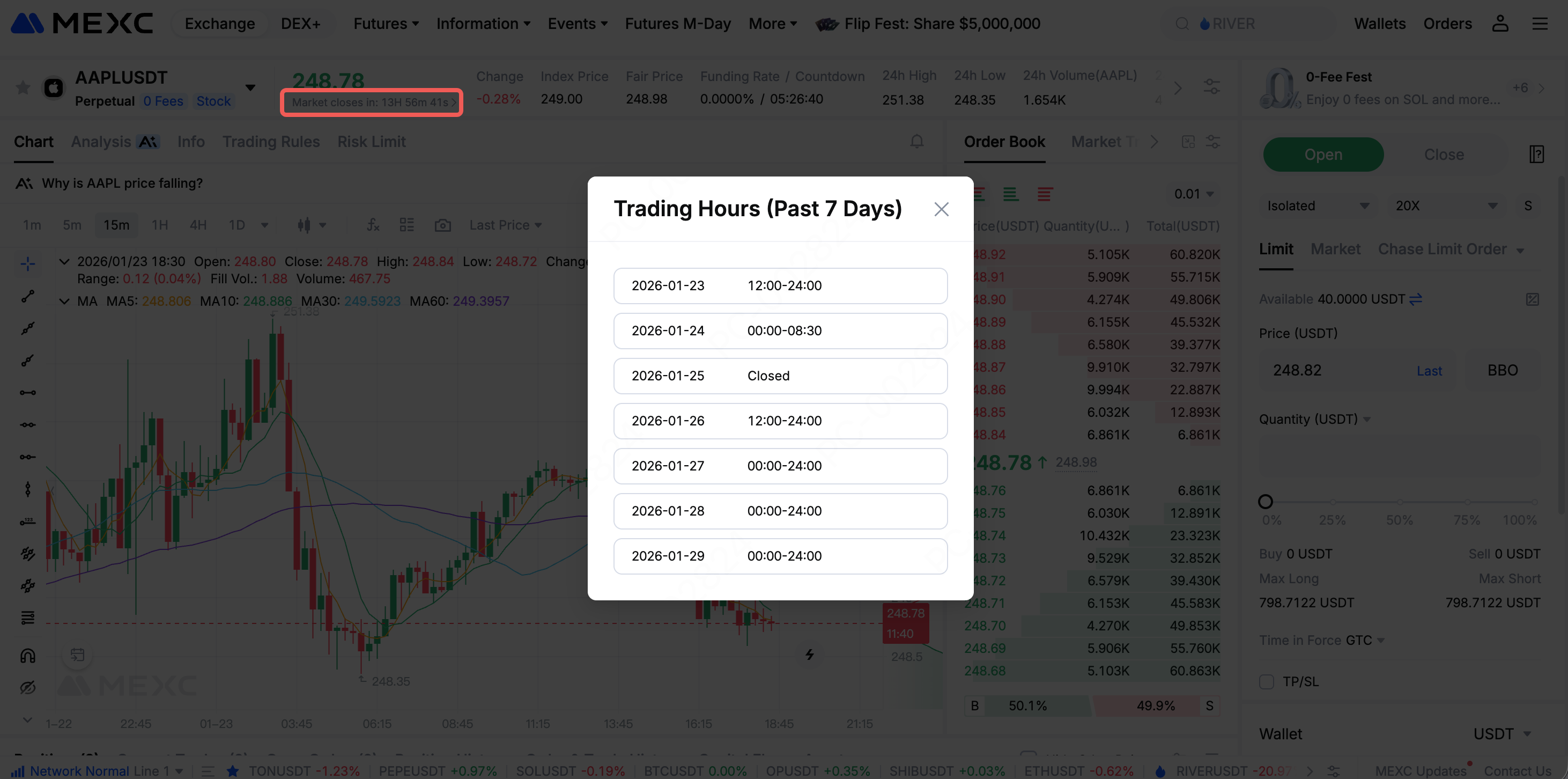 特别提示:MEXC 页面会清晰显示当前市场状态——如果标记为“休市”,表示美股尚未开盘或已收盘,此时合约只允许撤单和追加保证金,不可开新仓。请留意交易对旁的开盘/休市指示,合理安排下单时间,避免在休市状态下无法开仓或平仓。